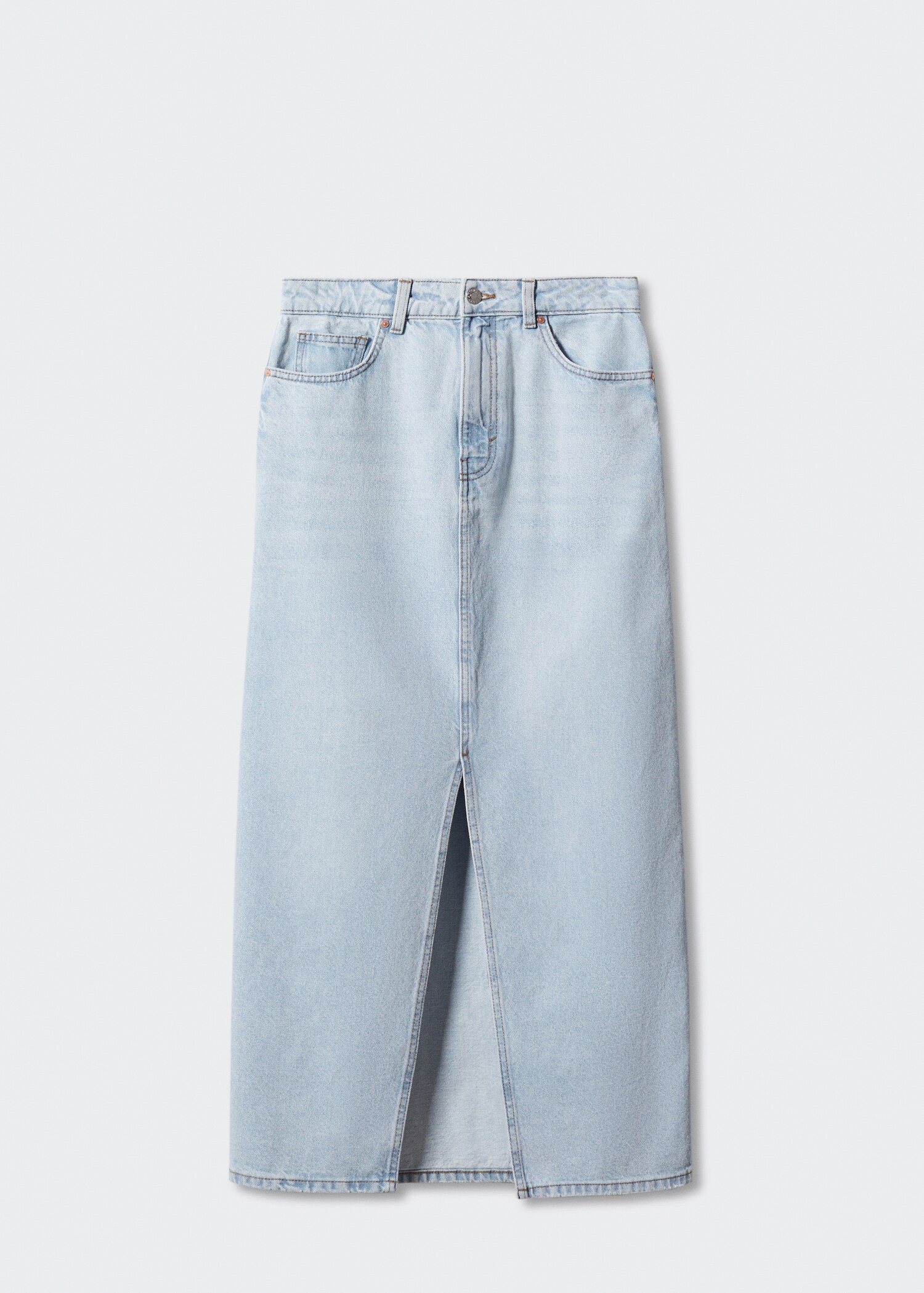 Denim style cotton fabric. Straight design. Long design. Medium waist. Five pockets. Loops. Zip and one button fastening. Back-slit hem. Festival Season.