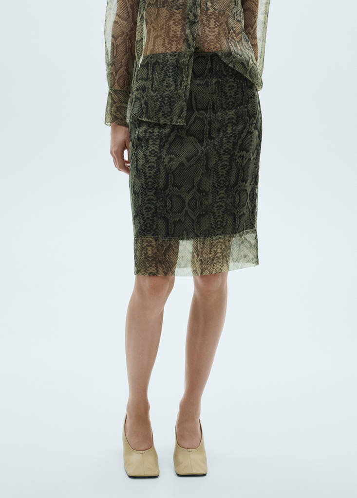 Organza fabric. Semi-transparent fabric. Midi design. Pencil design. Animal print. Mid-rise. Elastic waistband. No closure. Inner lining. Total look