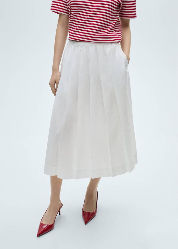 Cotton pleated skirtCurrent price [US$ 79.99 ]US$ 79.99Select a colourWhiteThe model is wearing size S and is 5'10" tall.Select your sizeXSNot available. I want it!SNot available. I want it!MNot available. I want it!LNot available. I want it!XLNot available. I want it!DimensionsNotify meAdd to WishlistSee lookFree shipping to storeMidi design. A-line design. Patterned design. Invisible lateral zipper fastening. 100% cotton fabricDetails, composition and careStore availabilityMango StylistAsk about deliveries, returns and moreAssistant