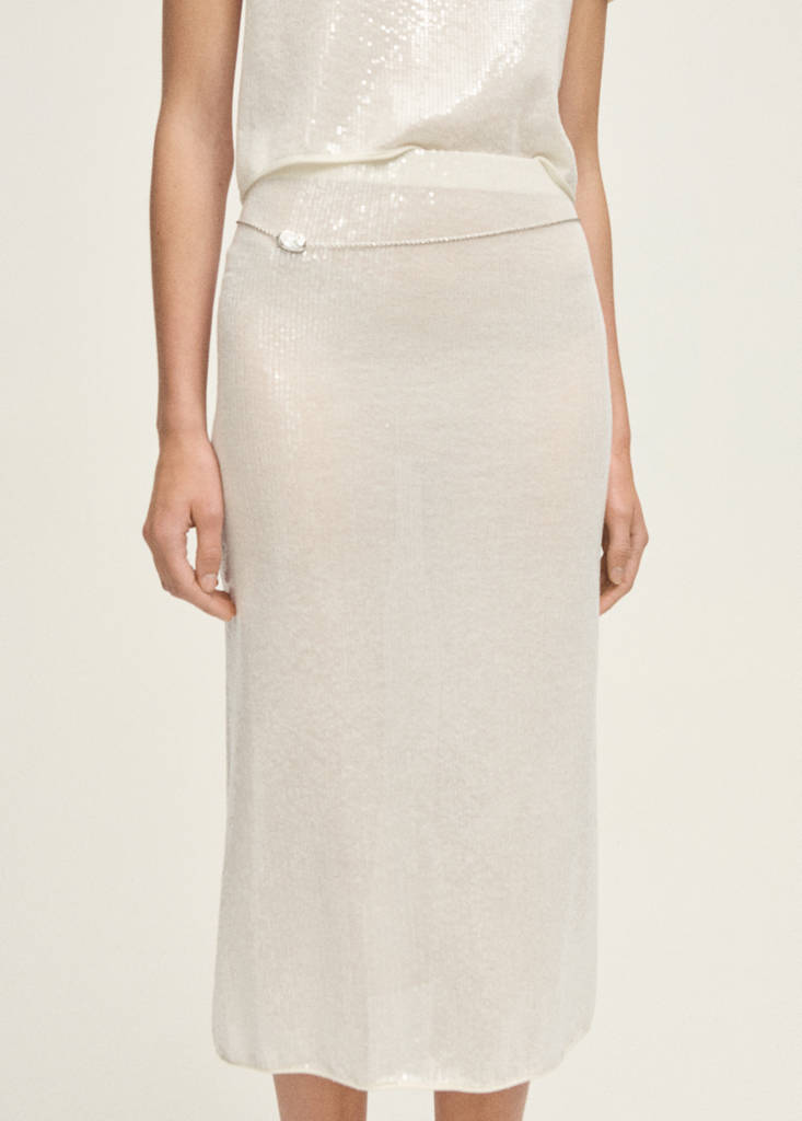 Fine knit fabric. Fabric with sequin. Pencil design. Midi design. Mid-rise. Elastic waistband. No closure. Total look. Party, ceremony, and communion collection. Selection Collection