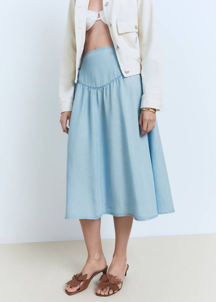 Lyocell fabric. Soft denim. Midi design. A-line design. High-rise. Back zipper closure