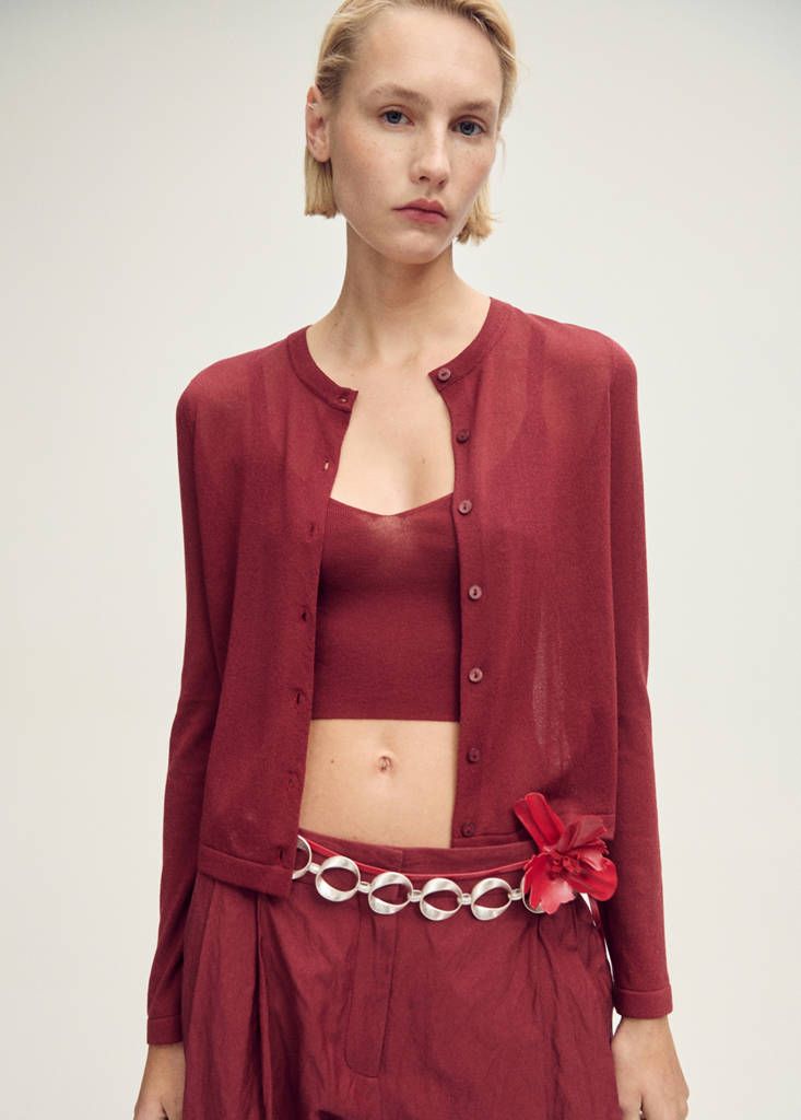 Fine knit fabric. Viscose fabric. Straight design. Standard design. Round neck. Long sleeves. Front button closure. Total look. Selection Collection