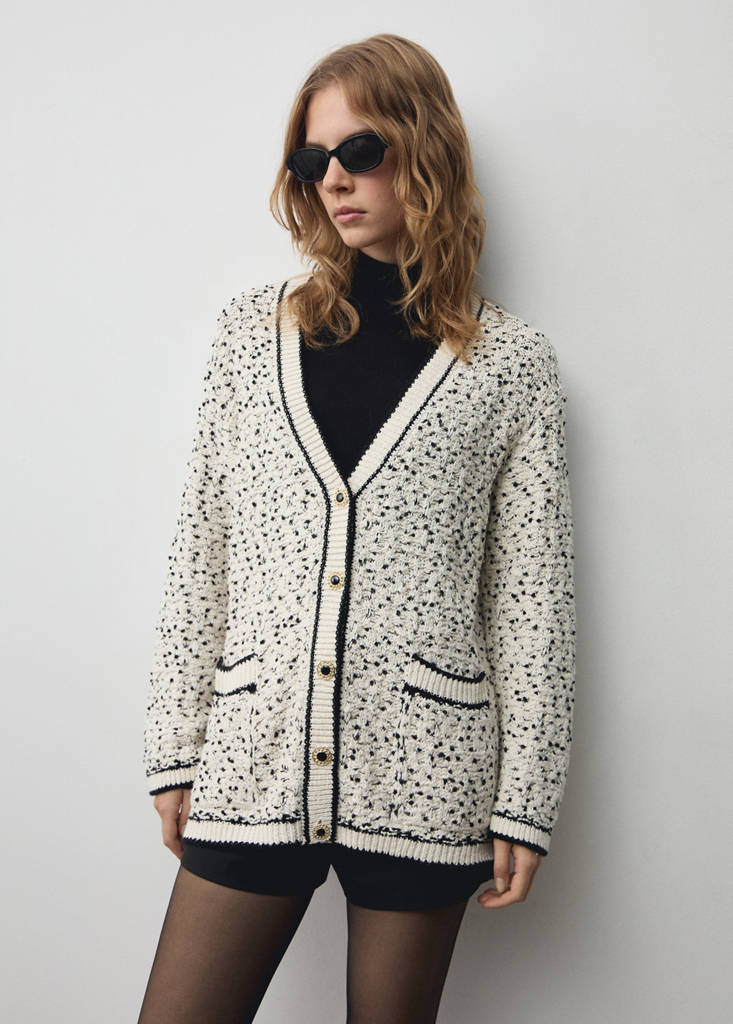 Chunky knit fabric. Flecked design. Oversize design. Long sleeves. V-neck. Button closure at the front. Jewel-effect buttons. Contrast detail. Two patch pockets on the front