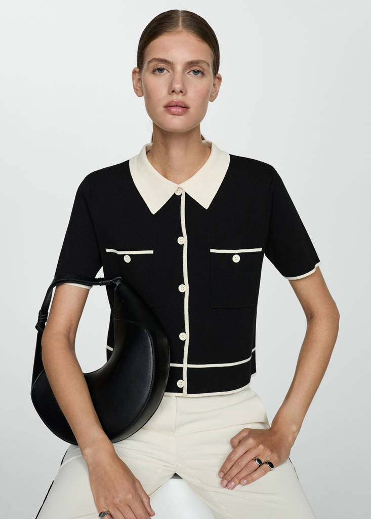 Fine knit fabric. Straight design. Short sleeves. Polo collar. Button closure at the front. Two buttoned welt pockets at front. Total look