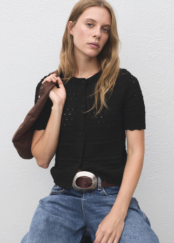Crafted in knitted fabric with a crochet design, this piece features a straight cut with a round neckline and short sleeves. It has a button fastening at the front. Complete the total look with the matching shorts