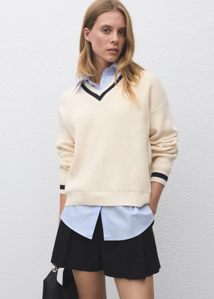 Crafted from chunky-knit fabric, this sweater paired with a cotton-blend shirt features a shirt collar and long sleeves. The contrasting details give it a distinctive air