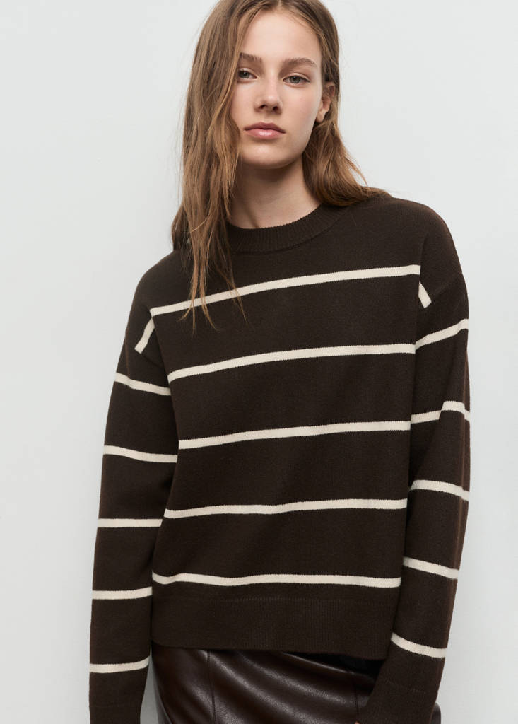 Knit striped sweaterCurrent price [US$ 69.99 ]US$ 69.99Select a colourChocolateSelect your sizeXXSNot available. I want it!XSNot available. I want it!SNot available. I want it!MNot available. I want it!LNot available. I want it!XLNot available. I want it!XXLNot available. I want it!1XLNot available. I want it!2XLNot available. I want it!3XLNot available. I want it!4XLNot available. I want it!DimensionsNotify meAdd to WishlistSee lookFree shipping to storeCrafted from medium-knit fabric, this sweater has a straight design with stripes. The box neck and long sleeves complete its style. Available in Plus SizeDetails, composition and careStore availabilityMango StylistAsk about deliveries, returns and moreAssistant