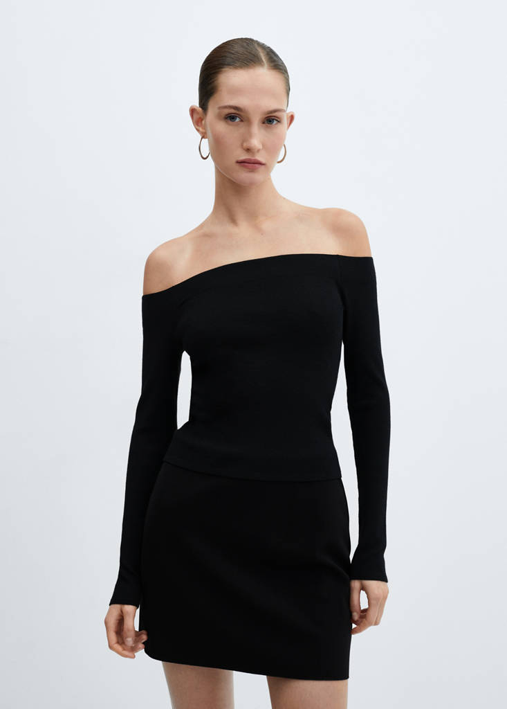 Off-the-shoulder knitted sweaterCurrent price [US$ 49.99 ]US$ 49.99Select a colourBlackThe model is wearing size S and is 5'10" tall.Select your sizeXSNot available. I want it!SNot available. I want it!MNot available. I want it!LNot available. I want it!XLNot available. I want it!DimensionsNotify meAdd to WishlistSee lookFree shipping to storeFine knit fabric. Straight design. Off-shoulder design. Off-Shoulder. Long sleeves. No closureDetails, composition and careStore availabilityMango StylistAsk about deliveries, returns and moreAssistant