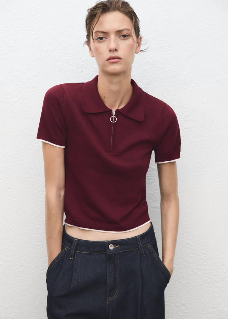 Fine knit fabric. Straight design. Polo-neck with zipper closure. Short sleeves. Contrast trims