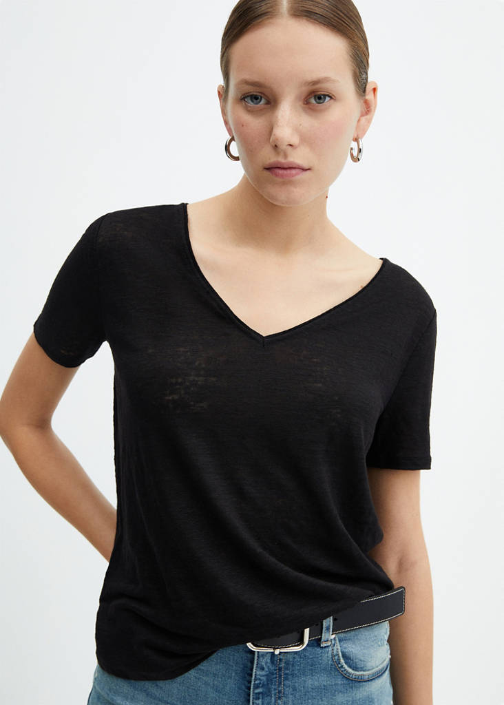 V-neck linen t-shirtCurrent price [US$ 39.99 ]US$ 39.99Select a colourBlackSelect your sizeXXSNot available. I want it!XSNot available. I want it!SNot available. I want it!MNot available. I want it!LNot available. I want it!XLNot available. I want it!XXLNot available. I want it!1XLNot available. I want it!2XLNot available. I want it!3XLNot available. I want it!4XLNot available. I want it!MeasurementsNotify meAdd to WishlistSee lookFree shipping to store100% linen fabric. Regular fit. Straight design. V-neck. Short sleeves. No closure. Available PlusDetails, composition and careStore availabilityMango StylistAsk about deliveries, returns and moreAssistant