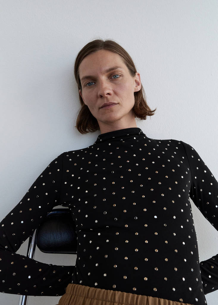 This fitted body-style design features an elegant funnel neck and long sleeves. It stands out for its crystal appliqué design. Button closure. Selection Collection.