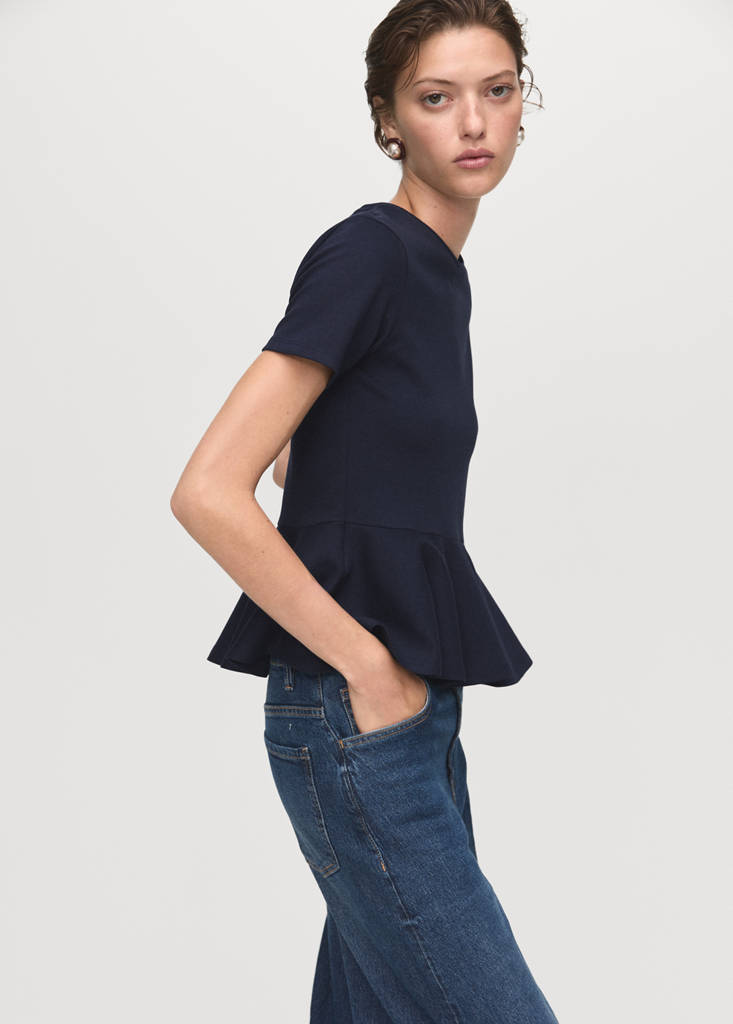 With a straight design and peplum cut, this garment features a round neck and short sleeves