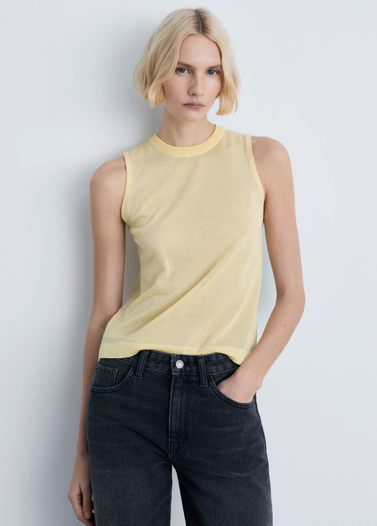 Fine knit fabric. Straight design. Round neck. Sleeveless. No closure