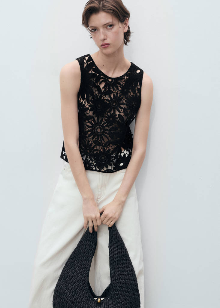 Cotton blend fabric. Knit fabric. Crochet design. Straight design. Round neck. Sleeveless. Wide straps. Button closure at the back