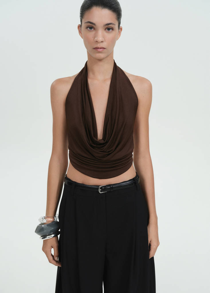 Fluid fabric. Fitted design. Crop design. Halter neck. Draped neck. Sleeveless. Open back. Adjustable fastening on the back. Party, ceremony, and communion collection. Selection Collection