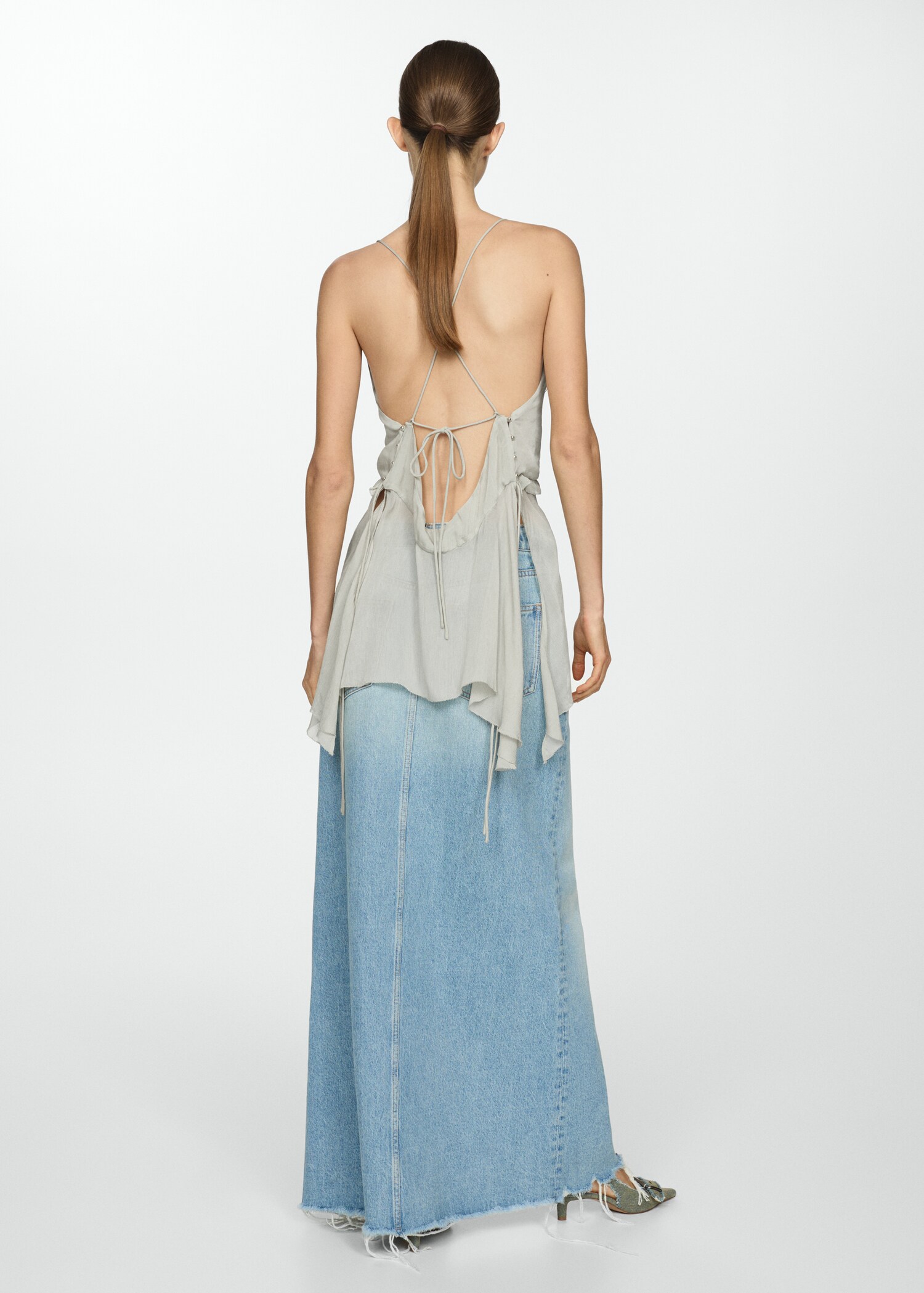 Flowy fabric. Textured fabric. Straight design. V-neck. Thin straps crossed at the back. Open back. Ruffles detail. Beaded detail. Glass beads. Asymmetric hem. Party and events collection.