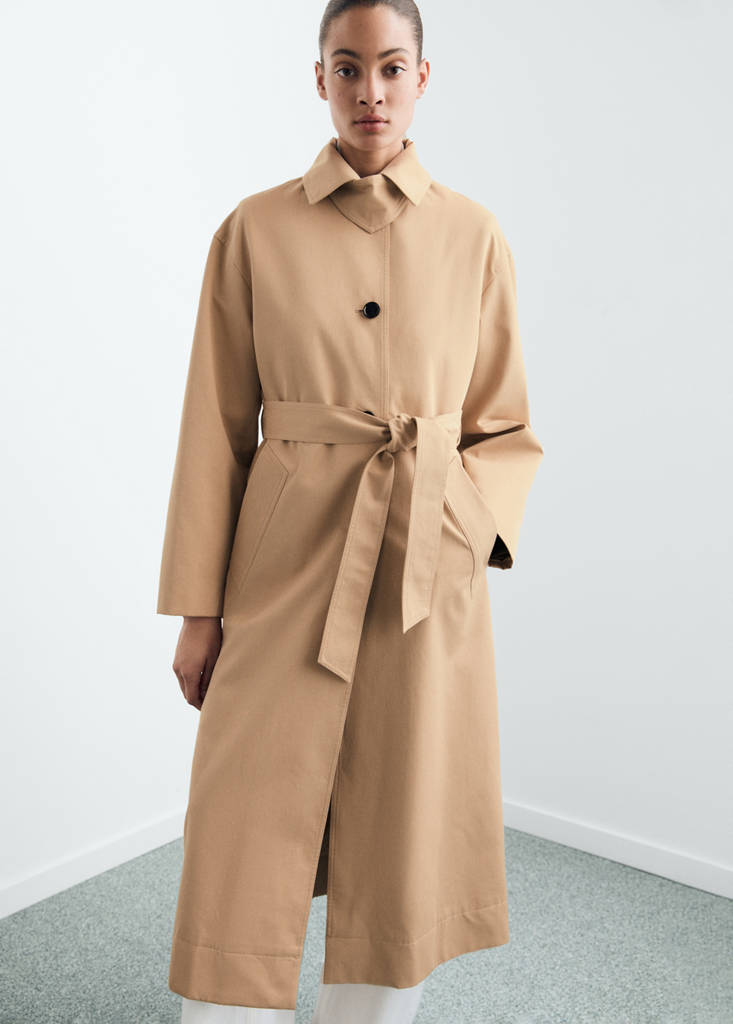 100% cotton fabric. Water Repellent: Technical water-repellent fabric. Long design. Straight design. High neck. Long sleeves. Two side welt pockets. Button closure at the front. Inner lining