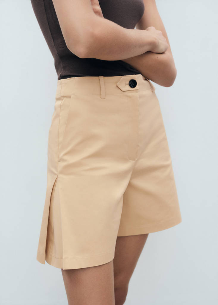 These shorts, featuring a straight design and a contemporary cut, stand out for their mid-rise, which offers comfort and style. The delicate side pleats add a touch of sophistication, making them an essential piece for a modern and chic look