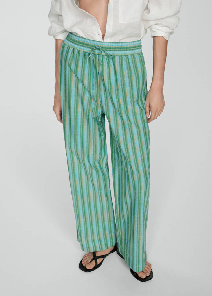100% cotton fabric. Flat structure Lightweight. Long Long. Regular Silhouette. Adjustable Waist/Elastic. Striped print. Long design. Straight design. Striped print. Two side pockets. Elastic waistband. Adjustable waist knot. Printed design