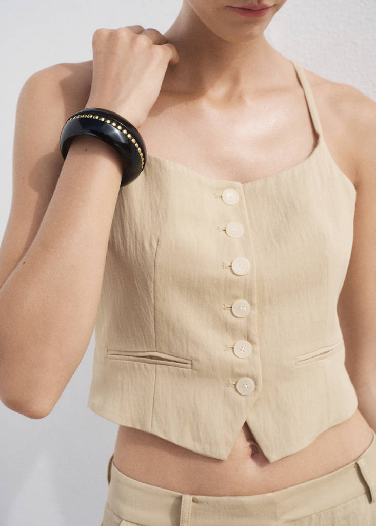 Straight design. Low-cut Neckline. Sleeveless. Thin straps. Front button closure. Inner lining. Total look