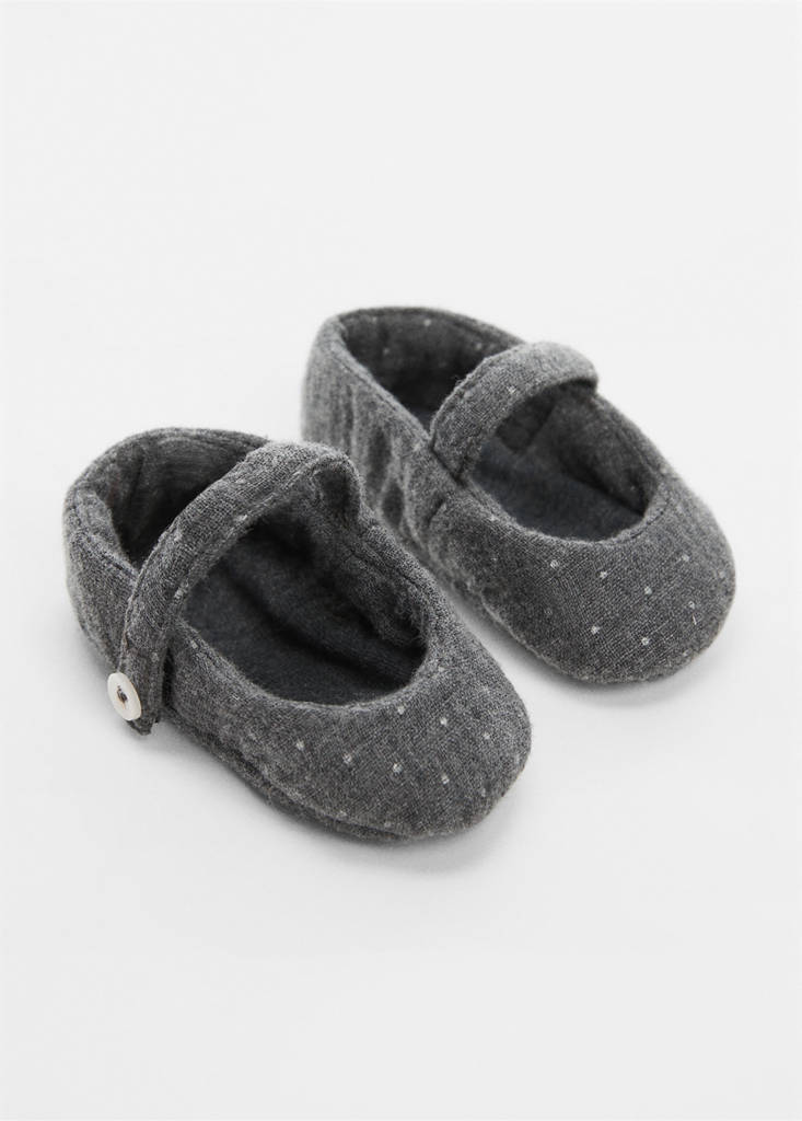 100% algodón, punta redonda, estampado de lunares, cierre de botón.
