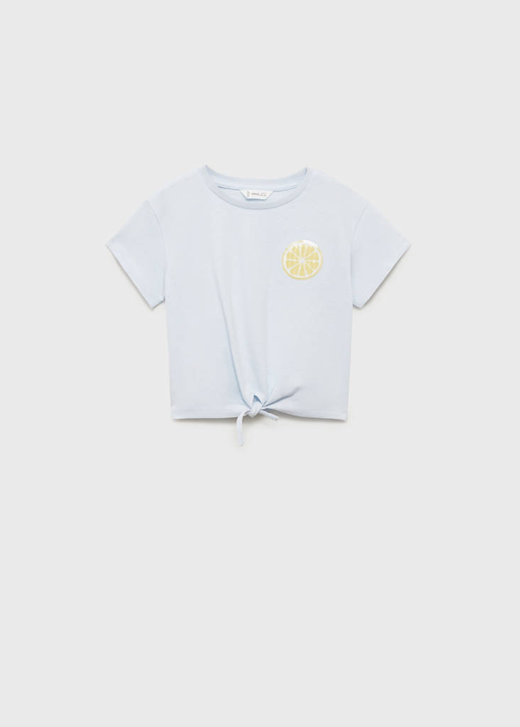 Tejido 100% algodón. Diseño recto. Cuello redondo. Manga corta ranglán. Lazo decorativo. Adorno de limón. Adorno de lentejuelas