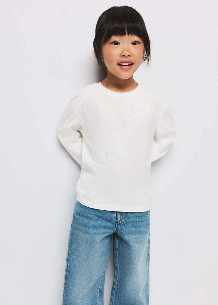 Tejido 100% algodón. Diseño recto. Cuello redondo. Manga larga. Bordado floral