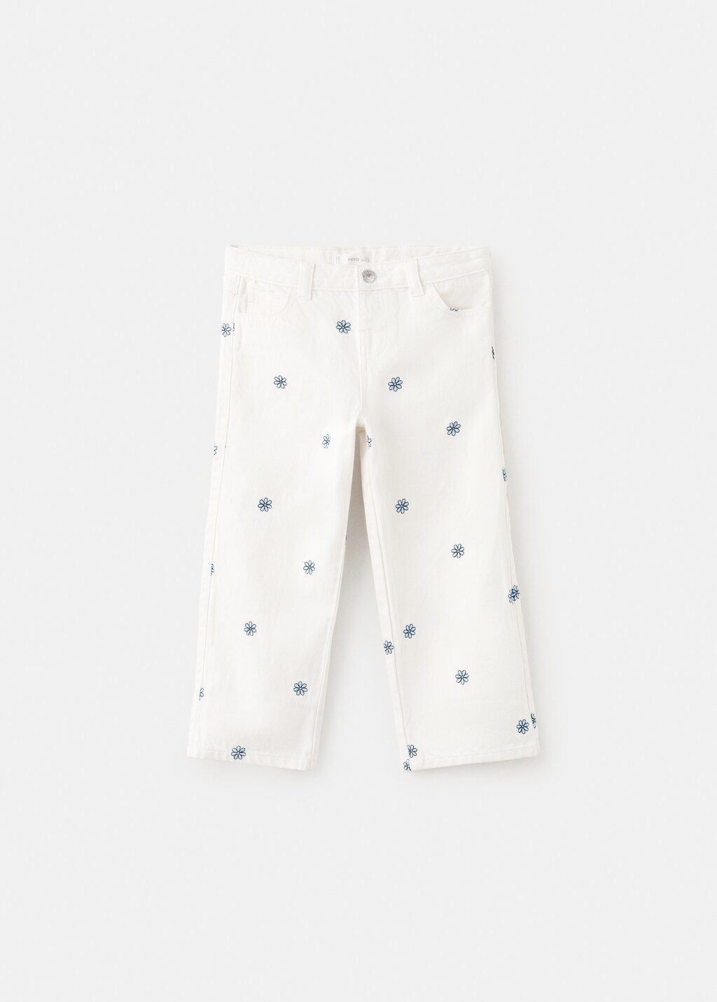 Tejido 100% algodón. Diseño recto. Diseño largo. Trabillas para cinturón. Cinco bolsillos. Cierre de cremallera y botón. Bordado de flores.