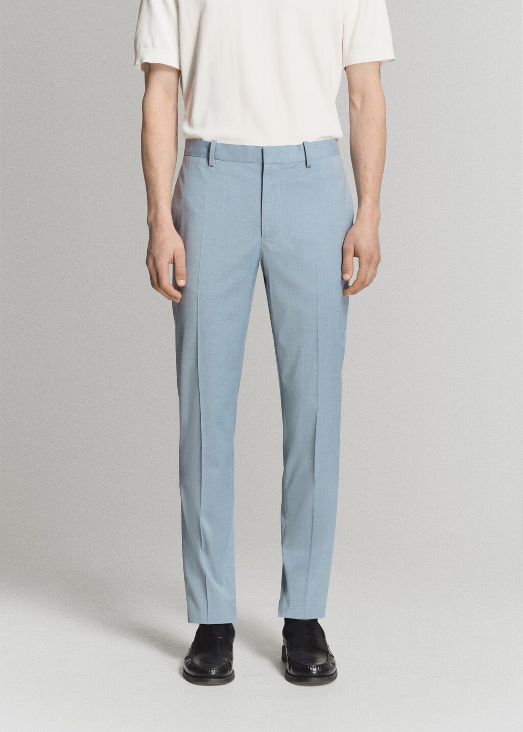 Super slim fit. Trabillas para cinturón. Cierre oculto de botón, gancho y cremallera. Dos bolsillos laterales. Dos bolsillos de ribete y botón en la parte posterior. Detalle de raya planchada en la parte delantera y trasera.