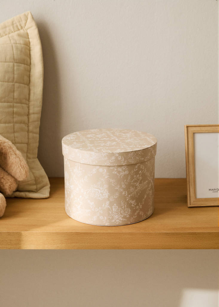 100% papel. Diámetro: 20cm. Altura: 15cm. Caja infantil estampada con diseño decorativo y romántico. Cilíndrica y con tapa, fabricada con un material de estilo cartón rígido, lo que le proporciona una estructura sólida pero ligera. De tamaño mediano, perfecta para guardar pequeños juguetes, accesorios o recuerdos, funciona tanto como elemento de almacenamiento como de pieza decorativa. Disponible en dos tamaños