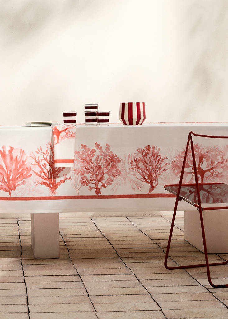 Tejido algodón y lino. Tamaño: 150x250cm. Este mantel diseñado para acomodar de 6 a 8 comensales, destaca por su confección de mezcla de lino y algodón proporcionando una textura natural y de alta calidad. Su diseño con diferentes corales a color aporta un toque natural y original a tu mesa. Combina con sus servilletas a juego