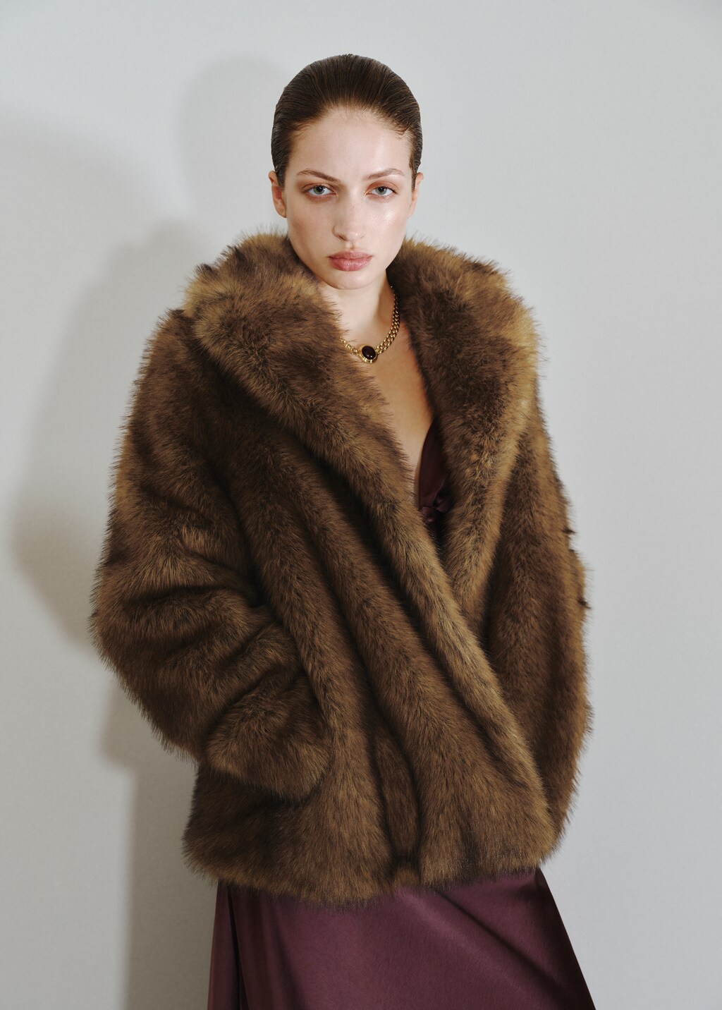 Efecto pelo. Diseño recto. Cuello pico con solapa. Manga larga. Cierre delantero con botones. Forro interior.