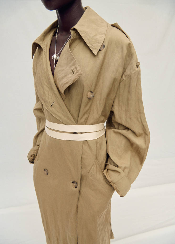 Tejido mezcla de algodón. Diseño largo. Diseño oversize. Efecto arrugado. Cuello de solapa ancha. Solapas con muesca. Trabillas en los hombros. Manga larga con puño de tira abotonada. Trabillas. Cinturón desmontable. Dos bolsillos laterales. Cierre de doble botonadura. Abertura posterior en el bajo. Colección Selection