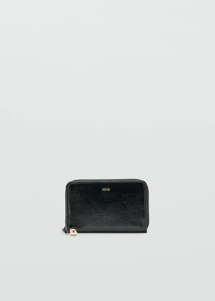 Tamaño mediano. Efecto piel. Múltiples ranuras para tarjetas. Bolsillo de cremallera. Abalorio metálico. Cierre de cremallera