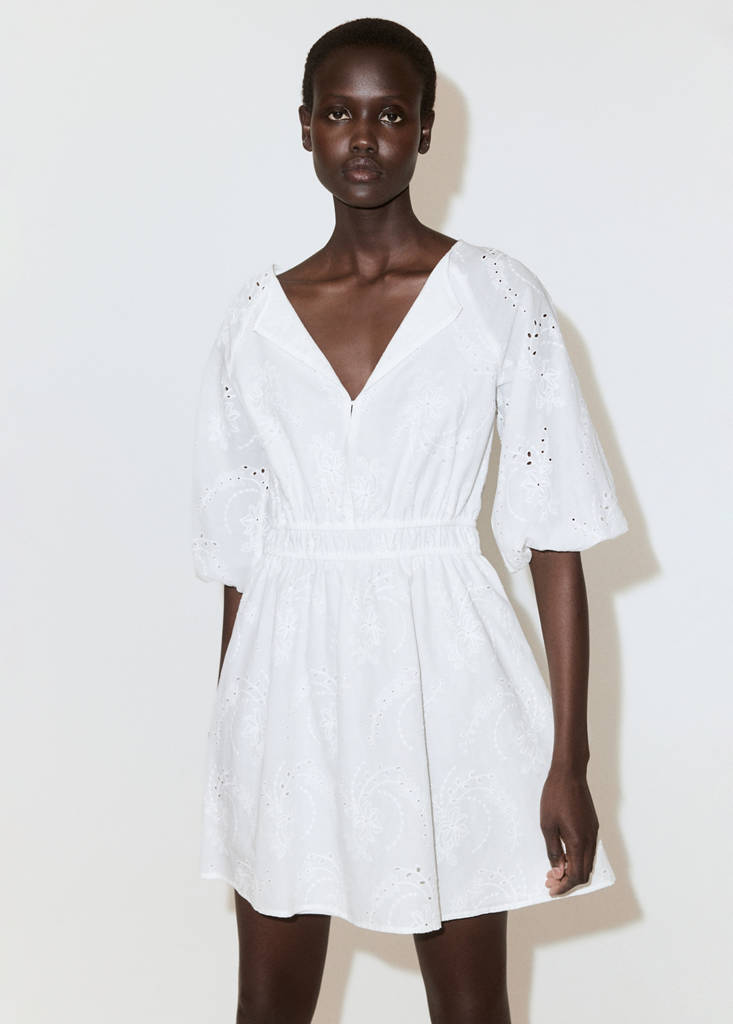 Tejido 100% algodón. Diseño corto. Diseño evasé. Diseño bordado floral. Cuello redondo. Cintura elástica. Manga tres cuartos. Sin cierre