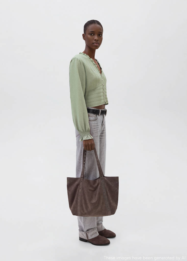 Confeccionada en tejido 100% algodón con textura, esta prenda presenta un diseño recto y un cuello pico fruncido. Las mangas largas tienen puños elásticos y fruncidos. El cierre delantero se realiza con botones