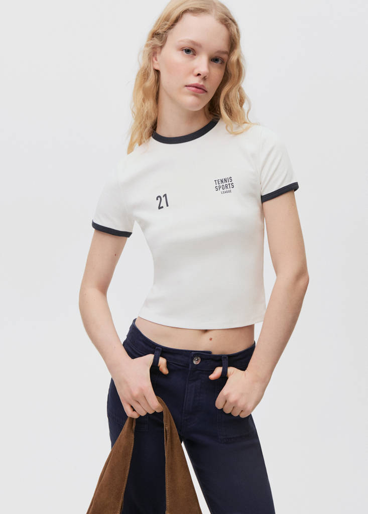 Tejido 100% algodón. Diseño crop. Cuello redondo. Cuello en contraste. Puños en contraste. Manga corta. Mensaje estampado en la parte delantera