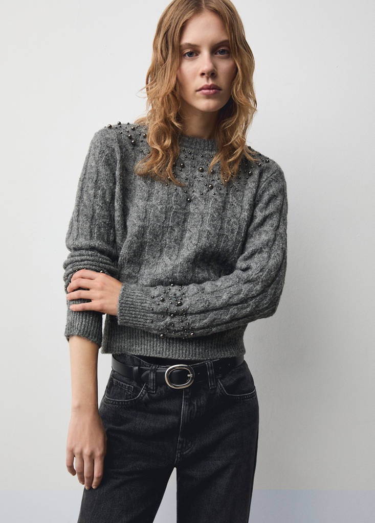 Tejido de punto grueso. Punto trenzado. Diseño recto. Cuello redondo. Manga larga. Detalle de abalorios. Sin cierre