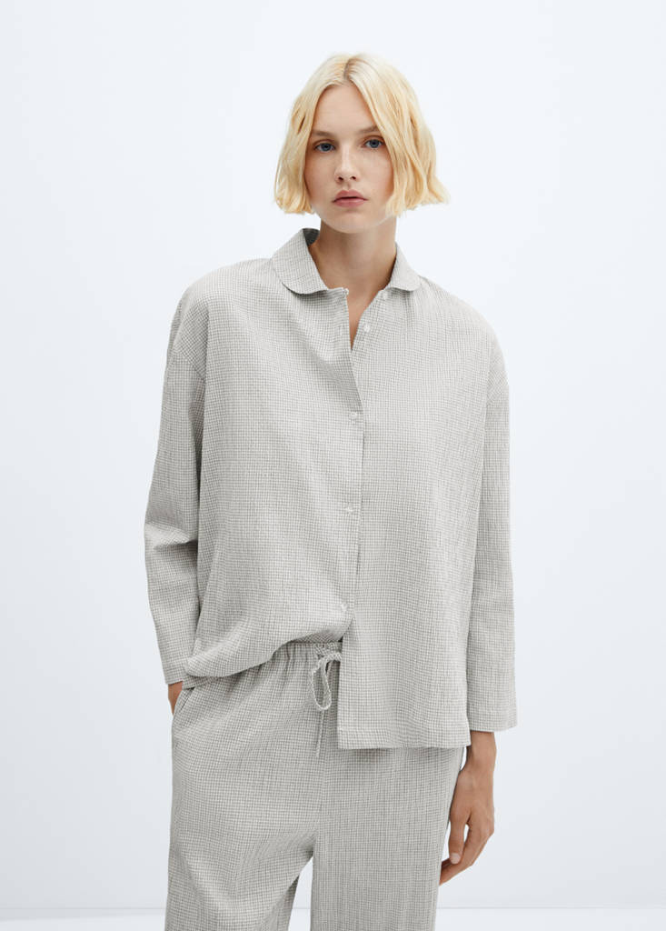Tejido mezcla de algodón. Diseño largo. Diseño recto. Estampado cuadro vichy. Cuello camisero. Manga larga. Cintura elástica con cierre de lazo. Set de dos. Cierre delantero con botones