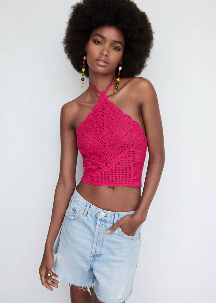Tejido mezcla de algodón. Tejido de punto grueso. Cuello halter. Diseño crop. Cierre de lazo en el cuello. Tirantes finos. Festival Season. Tejido de crochet