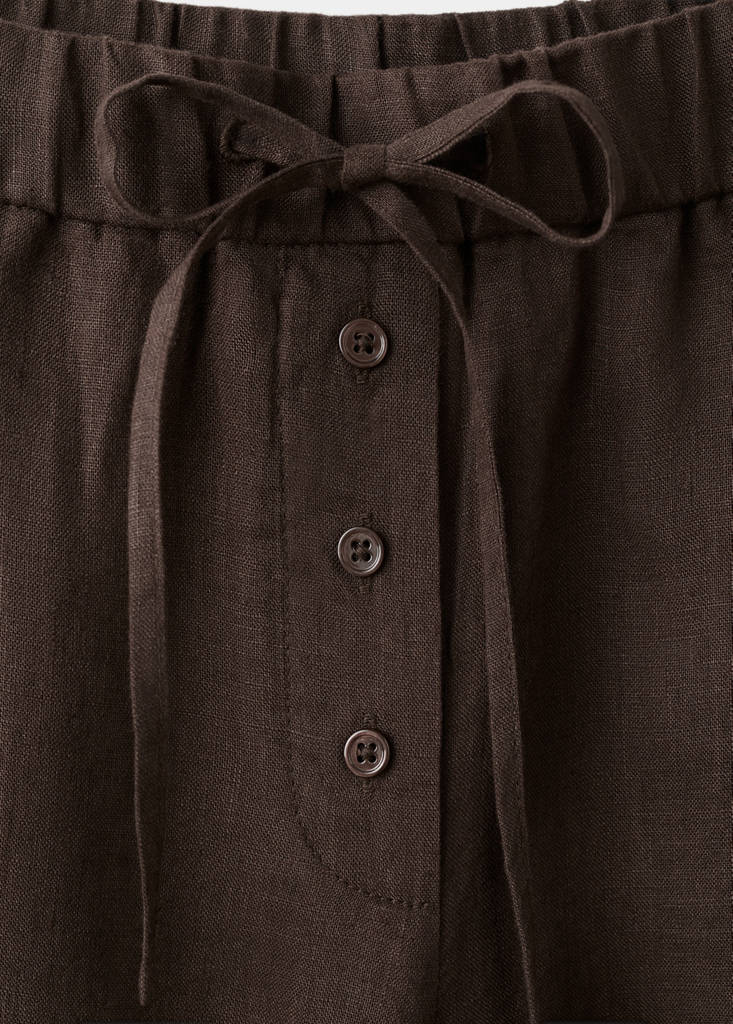 100% linen fabric. Straight design. Elastic waist with adjustable drawstring. Front closure with buttons. Inner lining