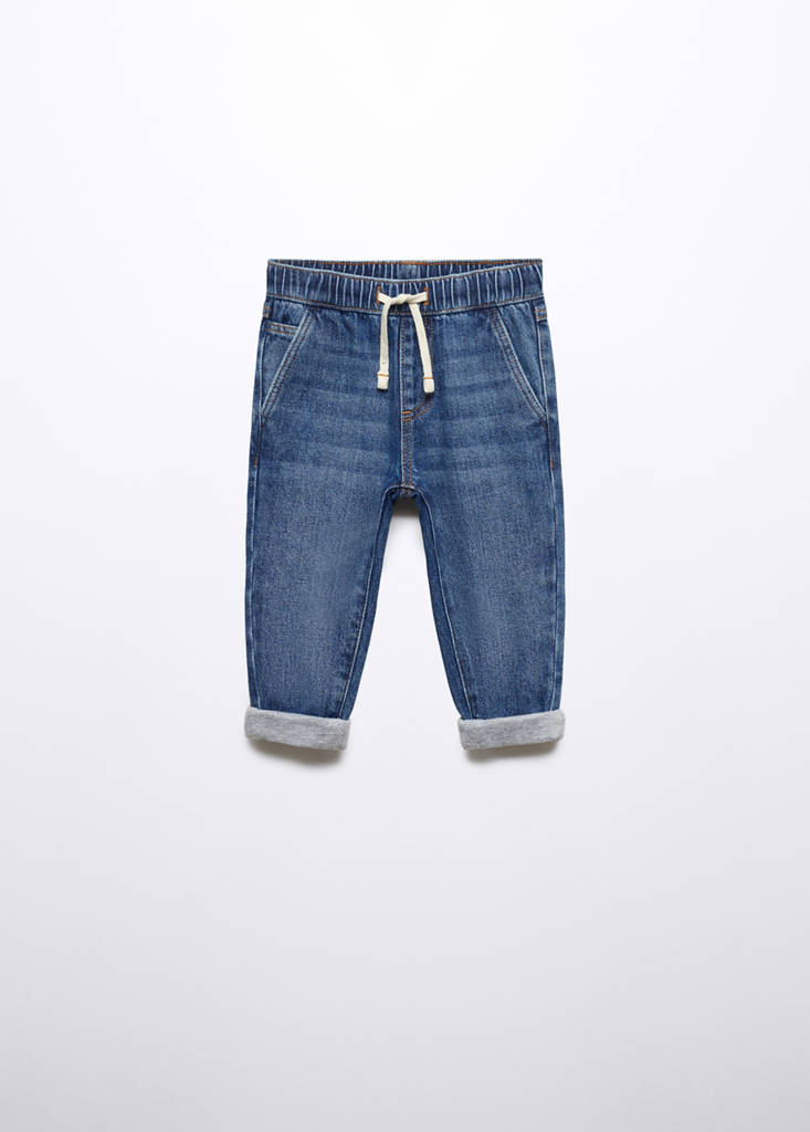 Denim-style cotton fabric. Stretch fabric. Elasticated waistband. Regular fit. Jeans with tie closure. Drawstring closure