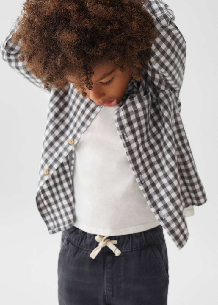 Denim-style cotton fabric. Stretch fabric. Elasticated waistband. Regular fit. Jeans with tie closure. Drawstring closure