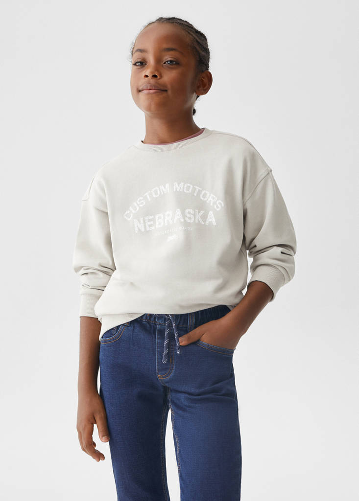 Basics Collection. Denim-style cotton fabric. Comfy-fit. Long design. Mid-rise. Adjustable elasticated waist. Drawstring closure. Five pockets. Back to school