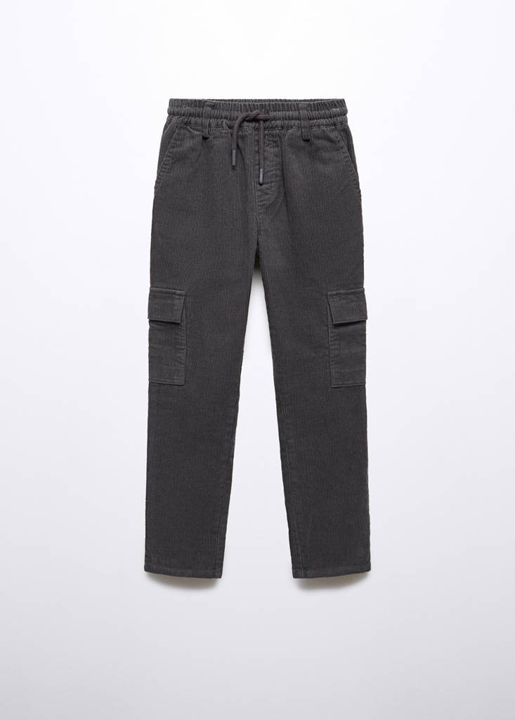 Micro corduroy. Cargo design. Mid-rise. Long design. Elastic waist with drawstring. Two side pockets