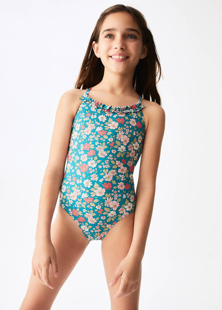 Flowers print. Ruffle details. Classic design. Thin crossover straps. Rounded neck. Sleeveless. Inner lining