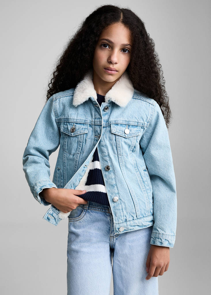 Denim-style cotton fabric. Straight design. Faux fur collar. Inner polar fleece lining. Long sleeves with buttoned cuffs. Jeans with tie closure. Button up