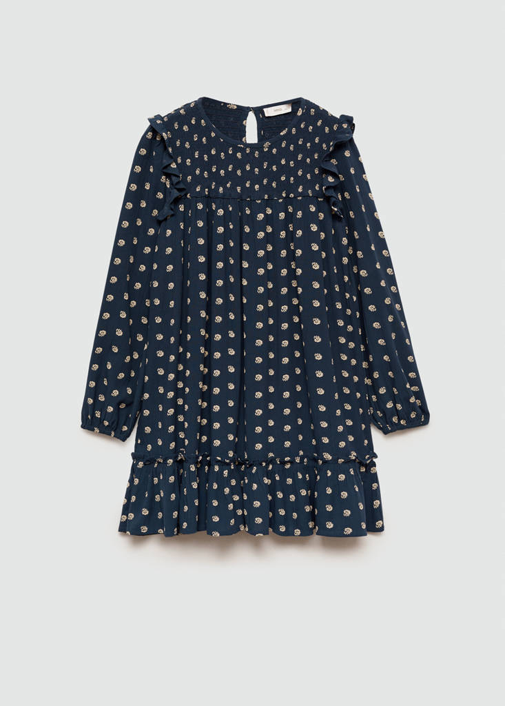Fluid fabric. Floral print. Round neck. Ruffle detail. Long sleeves. Button closure at the back. Viscose fabric