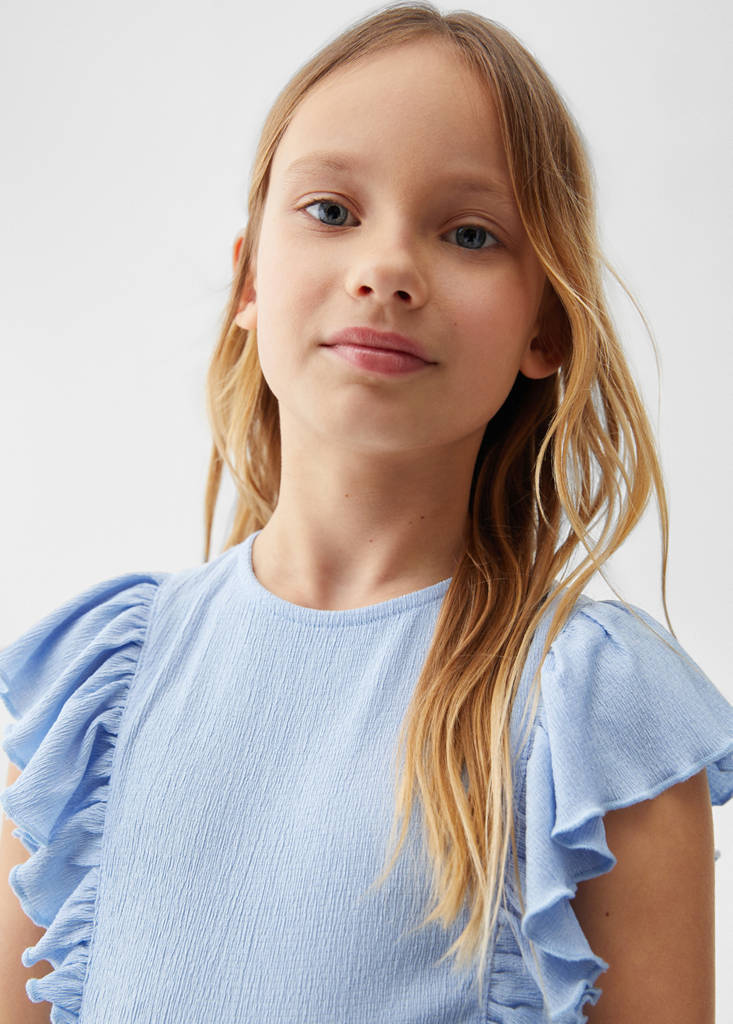 Textured fabric. Evasé design. Short design. Ruffle design. Rounded neck. Sleeveless. Teardrop fastening at back