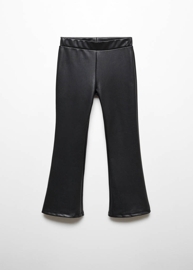 Flare design. Faux leather. Straight design. Long design. Elasticated waistband. No Fastening
